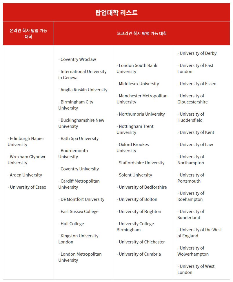 ‧ International University in Geneva ‧ Anglia Ruskin University ‧ Birmingham City University ‧ Buckinghamshire New University ‧ Bath Spa University ‧ Bournemonth University ‧ Coventry University ‧ Cardiff Metropolitan University ‧ De Montfort University ‧ East Sussex College ‧ Hull College ‧ Kingston University London ‧ London Metropolitan University |